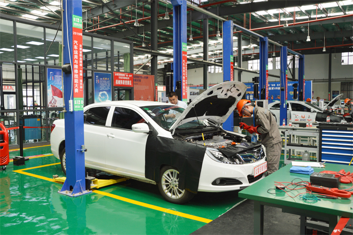汽车空调维修项目,左起:陈超(指导老师)、宁德磊(参赛选手二等奖)、徐涛(指导老师)
