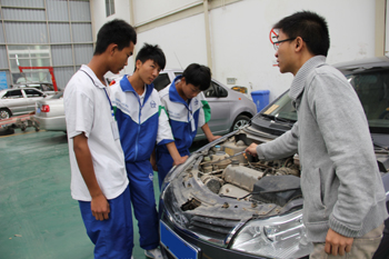 本学期学校将安排“浩龙汽车班”、“试点班”等11个汽修专业班级进入珠江源汽车城进行岗位认识实训和综合实训。为保证实训工作的顺利开展,,机械教研室主任宋建华、老师与浩龙公司副总经理冯刚、中华汽车4S店、奇瑞汽车4S店、长安汽车4S店、北京汽车4S店及华丰汽车装饰美容的售后服务经理在浩龙公司会议室召开了曲靖应用技术学校汽修专业学生到珠江源汽车城进行实训实习工作协调会。校企双方就学生实训的安排、管理及安全方面的事项做了交流。至30,我校“浩龙汽车班” 48名学生进入珠江源汽车城开展了为期一周的实训。全班分为5组,分别到中华汽车4S店、奇瑞汽车4S店、长安汽车4S店、北京汽车4S店及华丰汽车装饰美容公司实训。实训期间,学校每天安排一位专业教师驻扎企业进行现场指导。每组实训内容包括两个方向——汽车美容和汽车4S店实训。汽车美容实训主要由企业员工指导学生完成汽车洗车、汽车漆面美容及汽车贴膜实训内容。汽车4S店实训主要是将学生分组,在师傅指导下轮流对4S店工作岗位的机修岗位、漆工岗位、钣金岗位、维修服务接待岗位及汽车销售岗位进行实习。