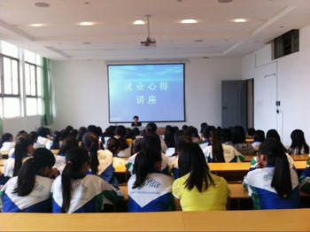 6月11日下午4:30分,经贸教研室邀请我校2006年电子商务2班毕业生张幔丽为二年级会计10、11班、商务会计1班学生进行就业指导讲座。讲座内容主要包括如何正确认识工作、认识社会、认识自我及应聘技巧四大块内容,她以自己的亲身经历,工作中的典型案例及相似的求职背景引起了在场学生的共鸣和反思,学生们表示深受教育启发,希望学校多开展此类活动。(来源:经贸教研室)