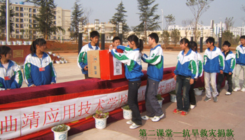 一方有难,八方支援,2012年3月31日,由学校牵头,政教科组织全校学生举行抗震救灾捐款,通过该次活动,增强了同学们的责任感和凝聚力。(政教科)