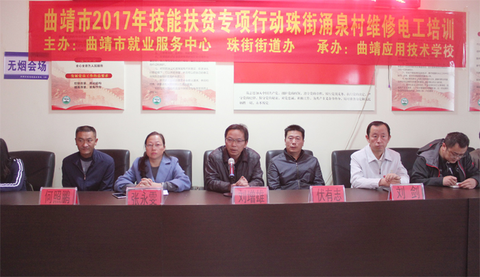 近日,由曲靖市人力资源和社会保障局主办、曲靖应用技术学校承办的2017年技能扶贫“维修电工”培训在麒麟区珠街涌泉、三源村委会开班。曲靖市就业管理服务中心副主任刘增雄、麒麟区人力资源和社会保障局副局长伏有志、珠街街道办副主任刘维等相关领导参加了开班仪式。市区人社局相关领导在开班仪式给学员诠释了培训的目的、意义和要求,希望学员珍惜难得的学习机会,认真学习,学以致用,让技能引领早日脱贫。学校党委委员张永雯老师介绍了学校的基本情况并对本期培训做了具体说明和安排。