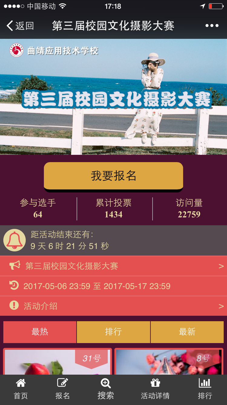 2.学校第三届校园文化摄影作品线下与线上展览投票活动开始啦!即日起至5月17日,所有影友均可进入投票区为自己喜欢的作品进行投票。学生们还可以通过“我要报名”将自己摄影作品上传参与活动。目前线上投票活动访问量达到22759,累计投票1434,参赛选手达64人,活动的热度还在持续高涨,参与人数越来越多。