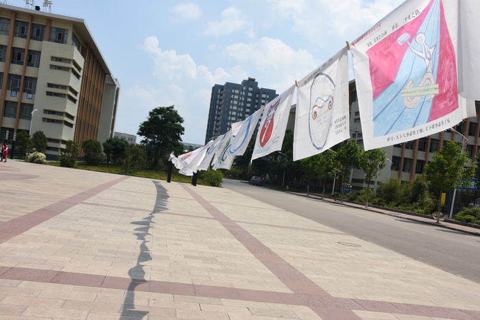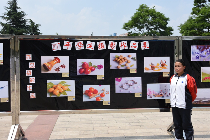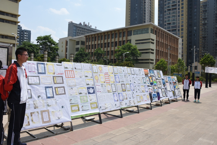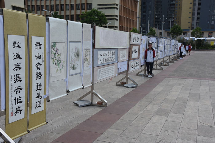 3.在学校教师的精心筹备组织下,我校在学校升旗广场展出了全校班级的班旗设计作品,展出了全校师生的书法、绘画、摄影等作品。