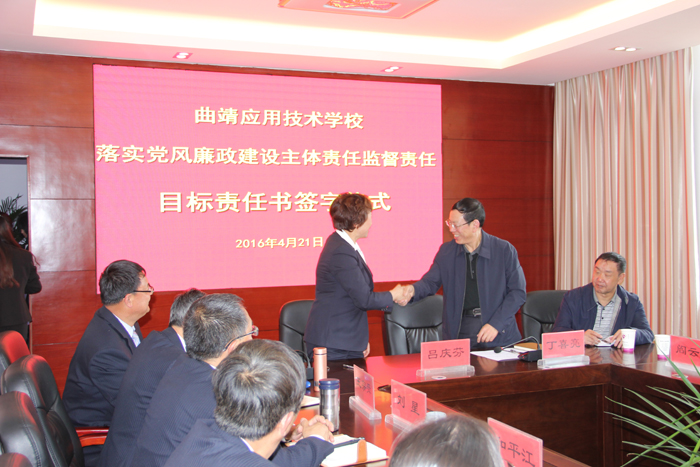 4月21日下午,我校与曲靖市纪委派出的第六纪工委签订落实党风廉政建设主体责任监督责任目标责任书。第六纪工委丁喜亮书记等领导及我校领导班子成员、中层管理人员、全体党员参加签字仪式。