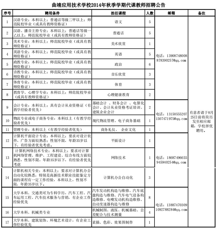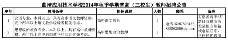 曲靖应用技术学校2014年秋季学期代课教师招聘公告