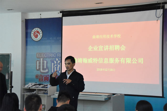 12月18至19日,学校邀请云南省通信产业服务有限公司、云南车管家汽车服务有限公司、曲靖翰威特通讯服务有限公司、曲靖家讯广告有限公司等18家企业到校为即将进入顶岗实习阶段的2016年秋招6个班级200余名学生进行招聘宣讲。