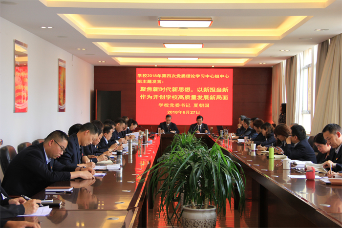 6月27日下午,学校在综合楼二楼中会议室召开2018年第四次党委理论学习中心组(扩大)会议,重点围绕《关于进一步激励广大干部新时代新担当新作为的意见》进行集中学习。学校党委班子成员参加会议,中层及以上管理人员列席会议,党委书记夏朝国同志主持会议并作中心发言。