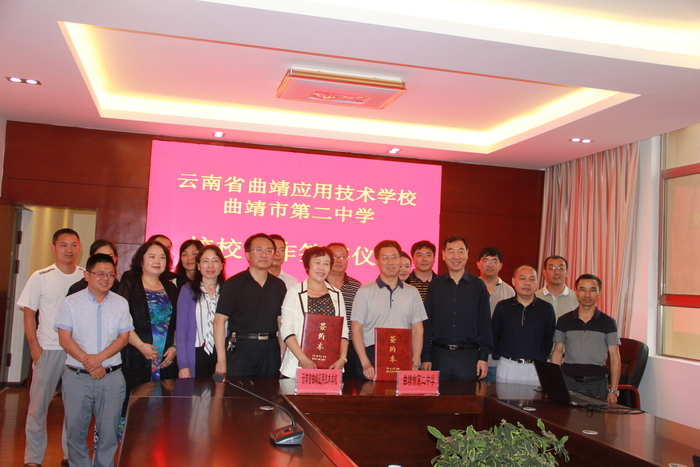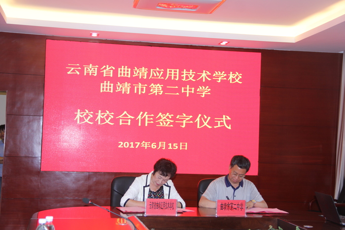 为打造普通高中与中等职业教育交流平台,实现普通高中与中等职业教育衔接,充分发挥双方资源优势,提升人才培养素质,6月15日下午,我校与曲靖市第二中学举行校校合作签字仪式,并在我校设立曲靖市第二中学技术体验教学实践基地。曲靖二中党委书记、校长李舜荣以及我校党委书记、校长吕庆芬,副校长郭海忠,副校长刘星、相关科室负责人参加了签字仪式。