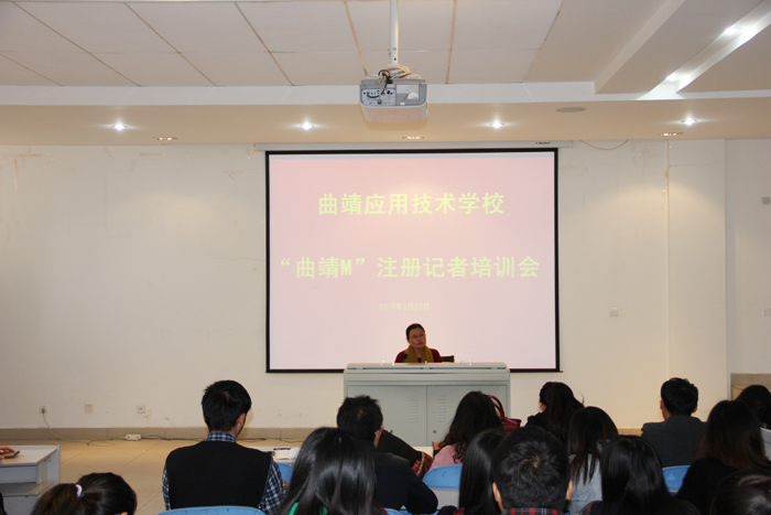 经过精心筹备,我校“曲靖M”注册记者于2016年3月中旬正式组建。3月23日下午学校办公室组织校内全体注册记者在综合楼101教室召开“曲靖M”注册记者培训会。会议明确了“曲靖M”注册记者职能权限,并邀请了曲靖银狐文化传播有限公司总经理韩东升从新闻的特点、要素、标题拟定和导语设计、摄影技巧等方面给注册记者做了培训。