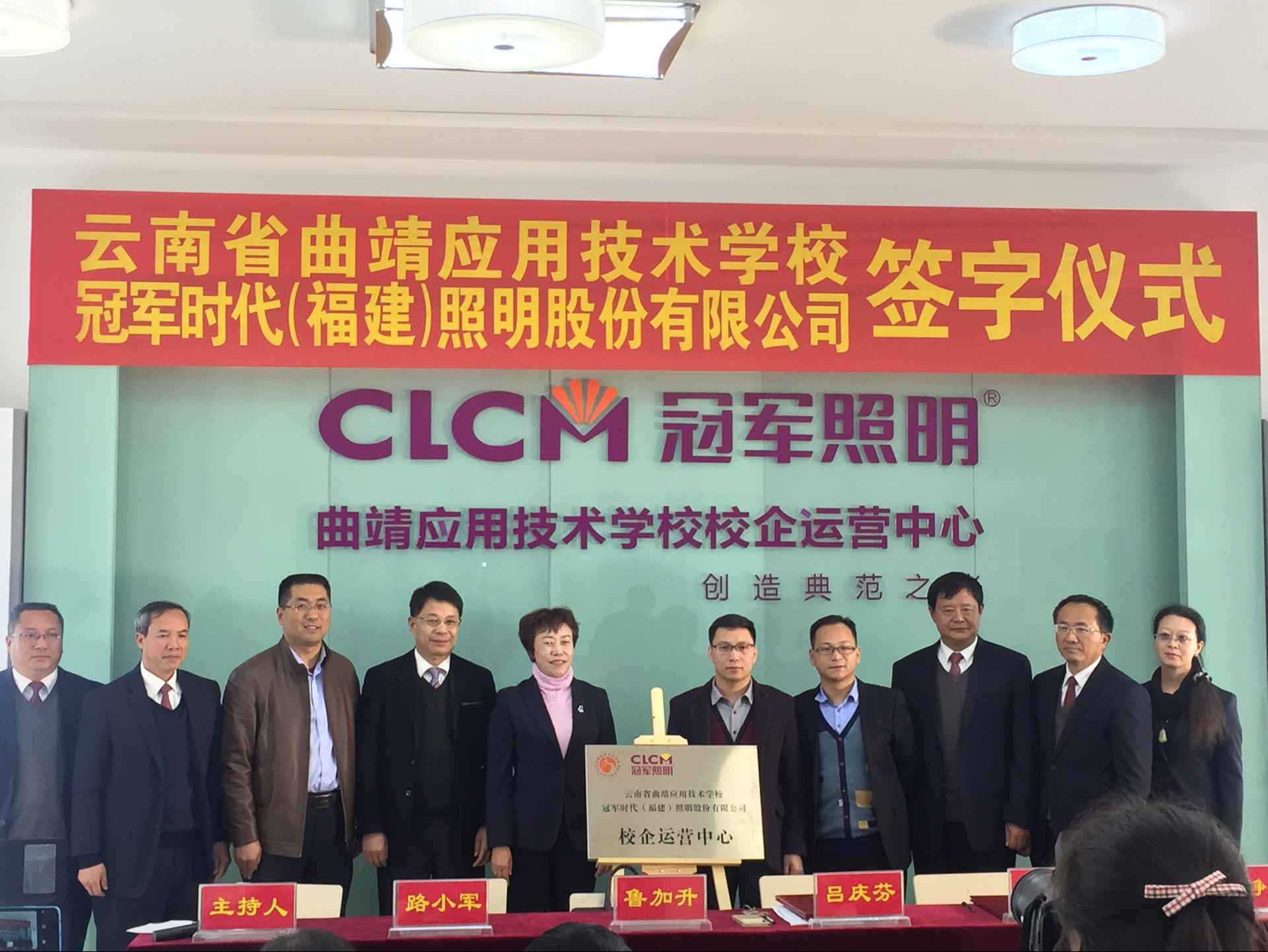 11月26日下午,冠军时代(福建)照明股份有限公司与我校校企合作签字仪式在学校“冠军照明·曲靖应用技术学校校企运营中心”展厅隆重举行。冠军时代(福建)照明股份有限公司总经理吴炳辉、华中大区总监陈铮、厦门南洋学院院长鲁加升、昆明官渡职校校长路小军、我校校长吕庆芬等人出席了签字仪式。