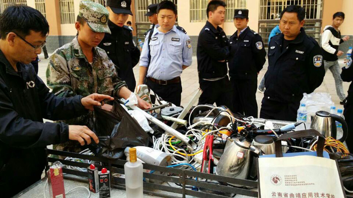 3月18日中午,学校保卫科、政教科、学生工作管理委员会、教官、校卫队协同文华派出所十五名警官对男、女生公寓进行了违禁物品清查行动,共清缴出管制刀具4把、钢管2根、电老虎18个、电吹风35个、电饭煲1个、烧水器8个、插线板若干,并对携带管制刀具的同学进行了严肃处理,严肃了校纪校风,消除了安全隐患,推动了平安校园的建设。(来源:保卫科)