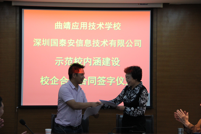 8月6日下午,学校在党委会议室举行了示范校内涵建设校企合作项目签字仪式,校长吕庆芬、副校长王宗舜、刘星、纪委书记周建平、教务科长刘莉明及深圳国泰安信息技术有限公司两位企业代表出席了签字仪式。