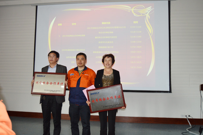 在此期间,学校领导与浙江吉利汽车有限公司顶岗实习学生座谈,深入了解了学生的思想、生活、工作情况,听取了学生对就业和顶岗实习的意见和心声,希望同学们在工作岗位上踏实工作,努力提高岗位技能。并于25日参加了“浙江吉利汽车有限公司2013年校企合作表彰会暨2014年高级蓝领启动会”,全国共有13所合作学校到会,我校荣获“优秀校企合作单位”,仅有两家学校获此殊荣,同时学校与浙江吉利汽车有限公司签订了高级蓝领订单培养校企合作协议。通过合作,双方将致力于培养汽车领域技术娴熟、手艺高超的技能人才,我们期待着 “吉利高级蓝领班”学生早日成为汽车行业发展的生力军。(来源:招就科)