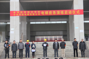 12月28日下午3:30,学校与云南帝安电梯有限公司在曲靖应用技术学校办公楼101教室及一号电梯处联合举办了电梯应急救援演练,云南省质量技术监督局特设处领导张建松、邹正勇,曲靖市质量技术监督局副局长江平、特种设备安全监察科科长叶卫东、麒麟区质量技术监督局局长付勇、云南帝安电梯有限公司总经理刘斌、学校副校长刘星等领导参加,电梯定点班全体学生观摩了演练全过程,了解了电梯维保人员采取的应急救援措施,明白了自己将来从事职业的重要性,体现了“校企合作,工学结合”人才培养模式的优势。演练结束后,校企双方签订电梯定点班校企合作协议并举行了人才培养基地授牌仪式。