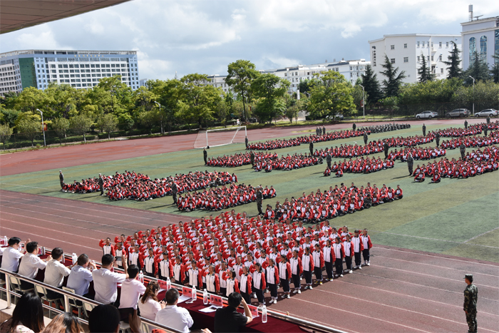 8月28日上午,学校2019年秋季学期新生军训会操表演在运动场隆重举行。学校中层及以上管理人员、校企合作负责人、各班级班主任及全校3300余名新生参加此次大会。大会由学校党委委员、副校长刘德华同志主持。