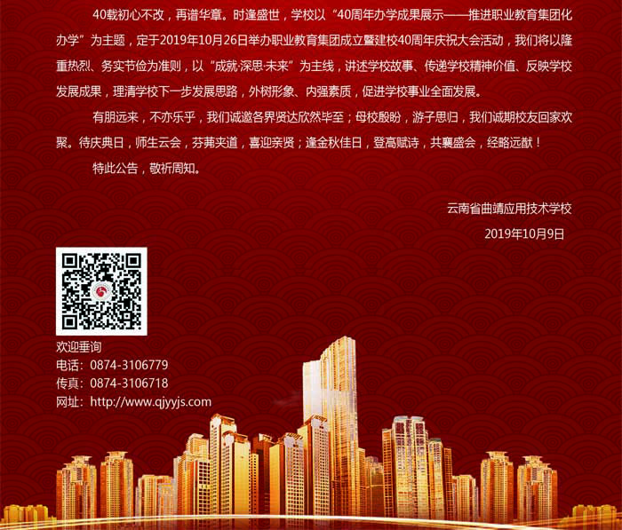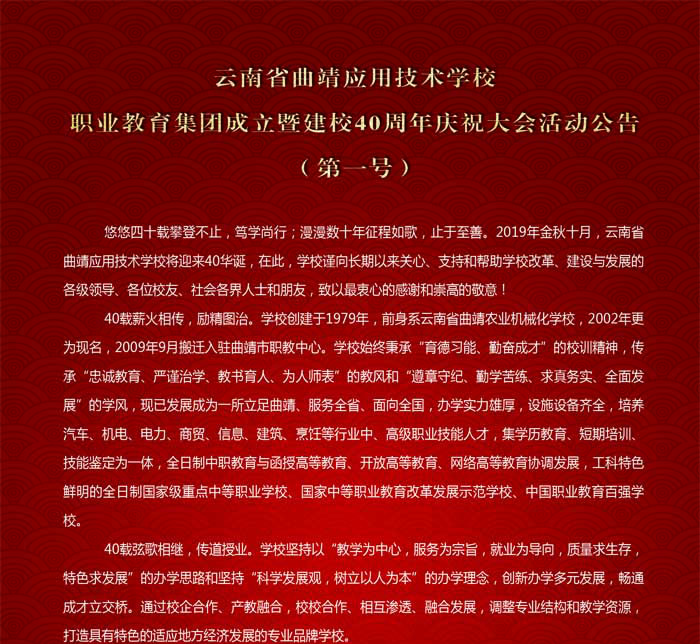 云南省曲靖应用技术学校职业教育集团成立暨建校40周年庆祝大会活动公告(第一号)