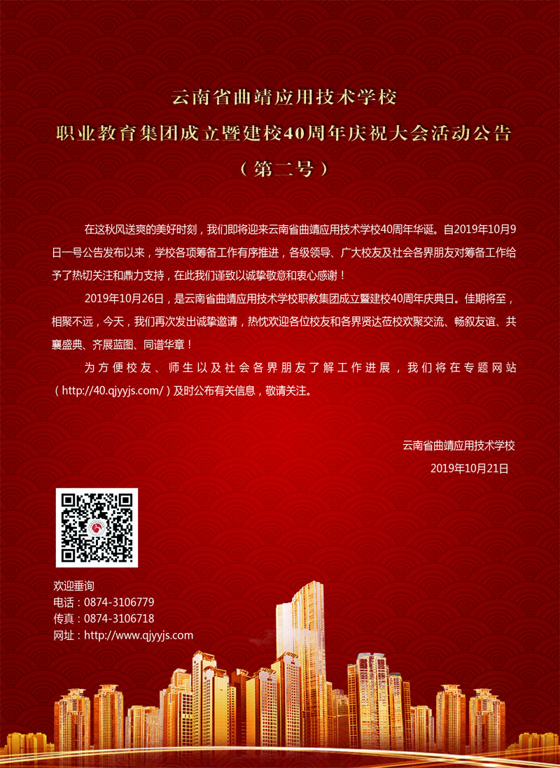 云南省曲靖应用技术学校职业教育集团成立暨建校40周年庆祝大会活动公告(第二号)