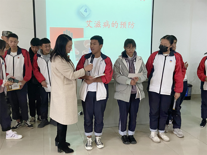 讲座中,高翠梅老师采用通俗易懂的方式向同学们介绍了什么是艾滋病、其发展历史及传播途径、感染艾滋病后的生理表现及反应等,并通过鲜活的事例、生动的语言,讲解了艾滋病的相关知识,警示学生自觉增强预防艾滋病的能力,叫响“控制艾滋病蔓延,从我做起”的口号,增强对艾滋病防治的全新认识和主动防艾意识。同时采用互动的方式让同学们来判断哪些是可能造成艾滋病传播的低、中、高风险行为并向同学们发放了艾滋病相关知识的宣传物品。学生们纷纷表示,作为新时代学生,要积极加入防艾志愿者队伍,参与到艾滋病防控的宣传工作中,从自身做起,携起手来,向“零”艾滋迈进,为促进学生身心健康发展助力。