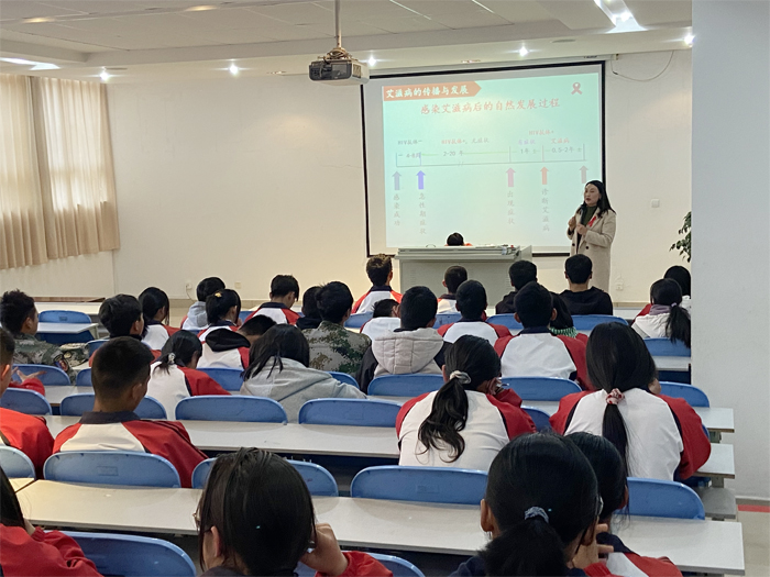 讲座上,学校副校长刘星发表讲话,他提到,今年是第33个“世界艾滋病日”,主题是“携手防疫抗艾,共担健康责任”。在校学生既是艾滋病防治宣传的重点人群,又是迎战艾滋病防治的主力军和生力军。他呼吁广大学生要洁身自好,从我做起,从源头上阻断艾滋病传播。