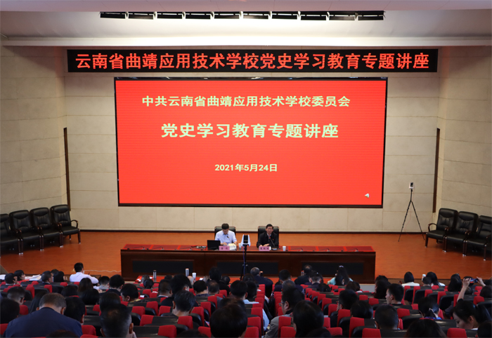 5月24日下午,学校举办党史学习教育专题讲座,邀请曲靖师范学院纪委委员、脱贫办主任、马克思主义学院党委书记、云南省教育系统党史学习教育宣讲团成员、曲靖市委政策宣讲团成员唐俊老师作题为《学党史 悟思想 办实事 开新局》的专题讲座。会议由学校党委书记夏朝国同志主持,全体师生参加会议。主会场设在智远楼报告厅,全体教职工在主会场参加会议 ;分会场设在各班教室,全体学生在分会场参加会议。