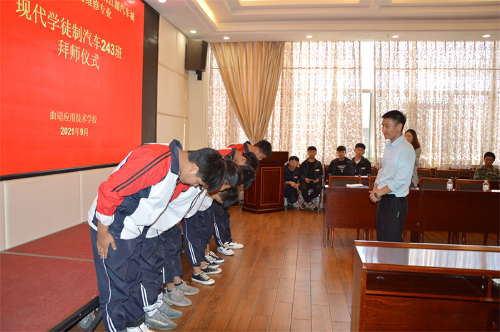 学徒工资发放仪式结束后,现代学徒制汽车243班的31名学生向企业师傅“拜师学艺”,行三鞠躬拜师礼,希望在师傅的精心培养下掌握一技之长,练就精湛技能,成人成才。