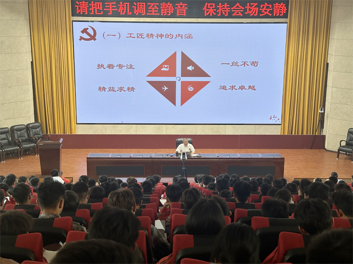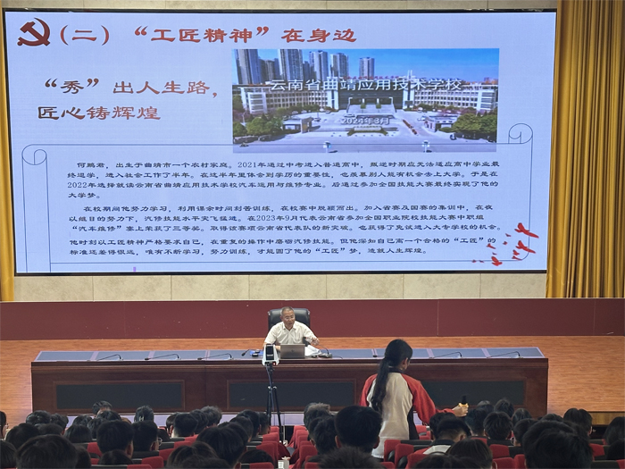刘校长从“树立工匠精神 ”“实践工匠精神的关键要素”“在学习中淬炼工匠精神”“让工匠精神点亮青春奋斗之路”四个方面,采用谈话法引出“工匠精神”的时代内涵,引导学生深刻认识“执着专注、精益求精、一丝不苟、追求卓越”的精神价值。以学校“五一劳动奖章”获得者黄泽、全国职业技能大赛获奖学生何鹏君的成长之路为例,让学生们对工匠精神有了更深的领悟