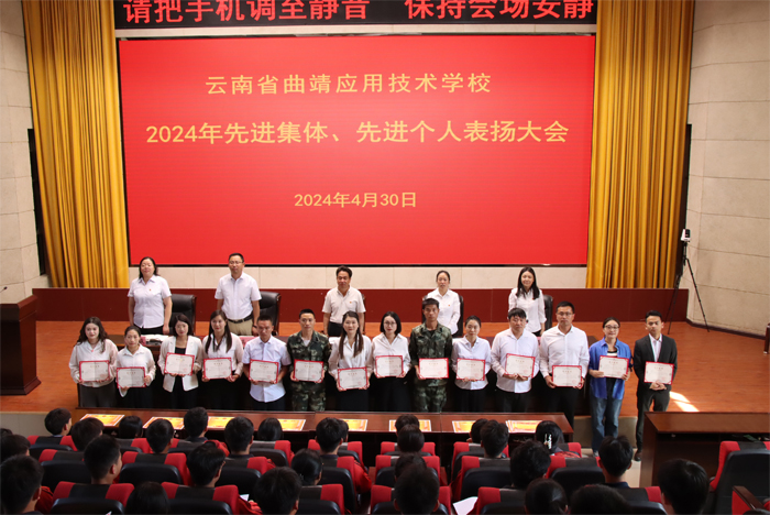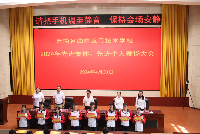 会上宣读了《云南省曲靖应用技术学校关于表扬2023年先进班级、先进班主任、三好学生、优秀学生干部、进步生的决定》《共青团云南省曲靖应用技术学校委员会关于表扬2023年五四红旗团支部、优秀共青团干部、优秀共青团员的决定》,共表扬先进班集体 18个、五四红旗团支部 12个、先进班主任 18人、三好学生 200 人、优秀学生干部 190 人、进步生 101人、优秀共青团干部 31人、优秀共青团员57 人。