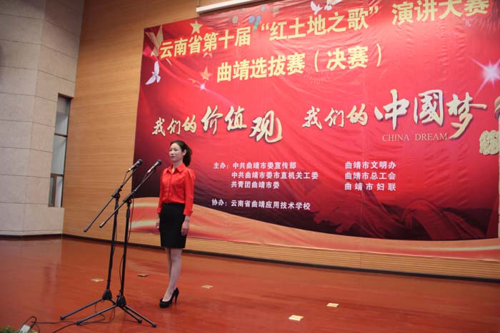 上午,云南省第十届“红土地之歌”演讲大赛曲靖选拔赛(决赛)在我校举行,本次演讲大赛由中共曲靖市委宣传部、曲靖市文明办、中共曲靖市委市直机关工委、曲靖市总工会、共青团曲靖市委、曲靖市妇联联合主办,云南省曲靖应用技术学校协办,以“我们的价值观、我们的中国梦”为主题,在选手精彩的演讲和生动的叙述中,热情讴歌了发生在我们身边的感人事迹,他们在不同的行业作出不平凡的事,他们淡泊名利、公而忘私,他们诚实做人、诚信做事,诠释了什么是有意义的价值观,诠释了一个个普通人的“中国梦”的美好形象。