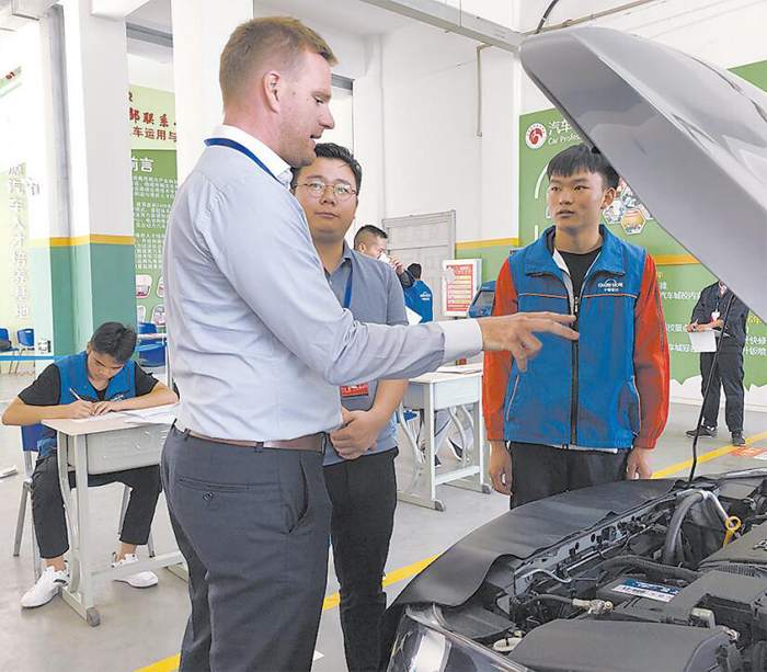 “今年考试时间从5月23日持续至25日,考试按照德国对汽车维修技能人才的评价标准,完成来自云南4家学校中德诺浩项目学生的考证工作。考试分理论考试、实操考试两项。”曲靖应用技术学校副校长刘星表示。考试现场,来自德国的考评专家Bitschnaumarcel,在现场进行巡考。
