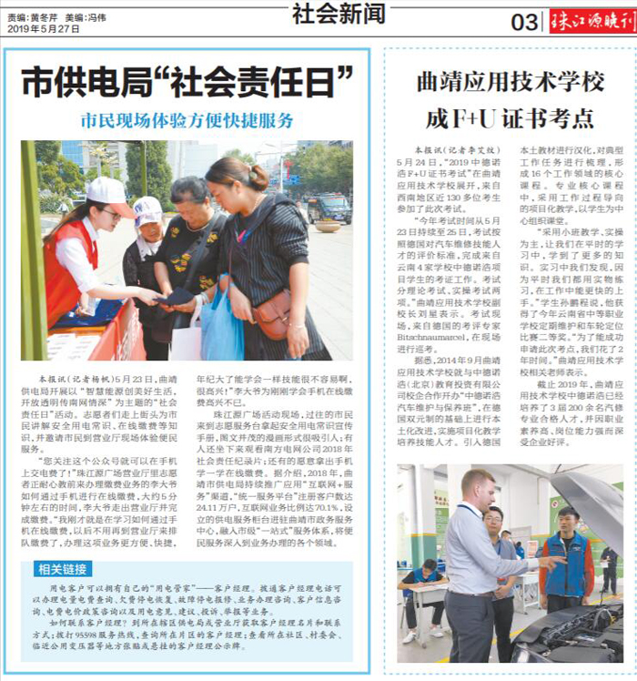 曲靖日报讯(记者李艾纹) 5月24日,“2019中德诺浩F+U证书考试”在曲靖应用技术学校展开,来自西南地区近130多位考生参加了此次考试。