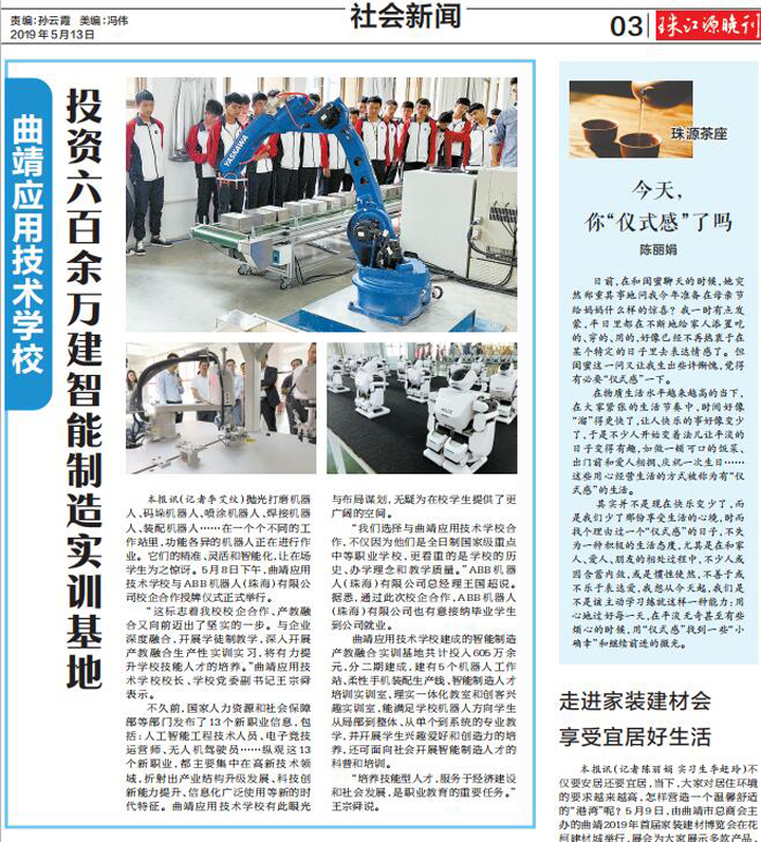 曲靖日报讯(记者李艾纹)抛光打磨机器人、码垛机器人、喷涂机器人、焊接机器人、装配机器人……在一个个不同的工作站里,功能各异的机器人正在进行作业。它们的精准、灵活和智能化,让在场学生为之惊讶。5月8日下午,曲靖应用技术学校与 ABB 机器人(珠海)有限公司校企合作授牌仪式正式举行。