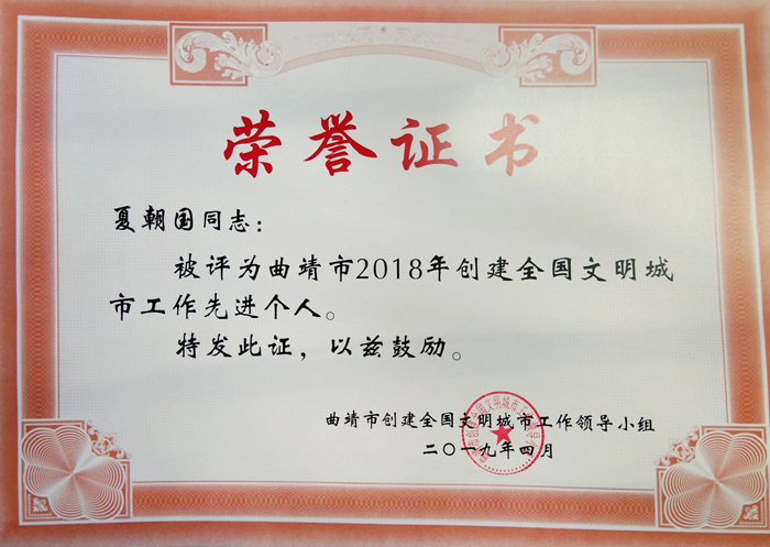 4月11日下午,中共曲靖市委市政府组织各单位主要领导召开2019年曲靖市创建全国文明城市工作会议,现场通报表彰了在2018年创建全国文明城市工作中敢于担当、善于作为、苦干实干、勇于奉、献成绩突出的99个先进单位和360名先进个人。我校党委书记夏朝国同志荣获“先进个人”称号。