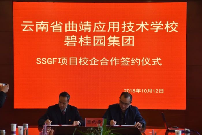 10月12日下午,学校与碧桂园集团签订SSGF项目校企合作协议。出席此次签约仪式的有学校党委副书记、校长王宗舜,学校副校长刘星,碧桂园集团曲靖城市公司总经理李政,综合部经理敖龙朝,学校深度合作企业云南海魂硅藻泥科技有限公司总经理付文斌,学校相关科室负责人。