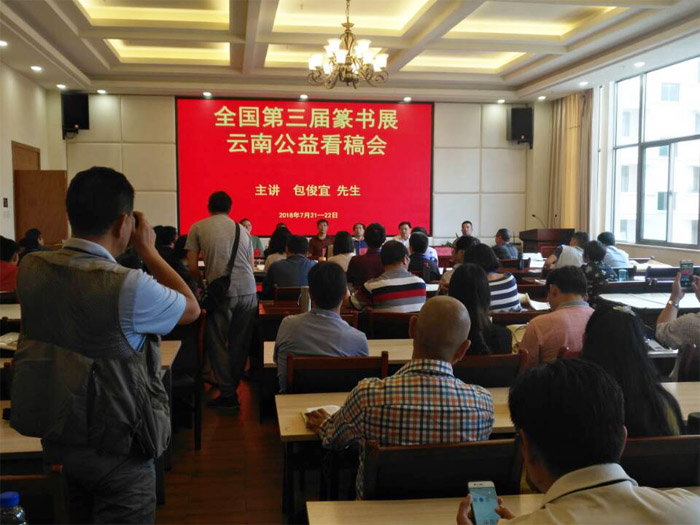 为全面贯彻落实习近平总书记在文艺工作座谈会和中国文联第十次文代会上的重要讲话精神,进一步推动云南书法事业的繁荣发展,并力争在全国第三届篆书作品展中再创佳绩,云南省书协特邀了中国书协副主席、篆书委员会主任、贵州省书协主席包俊宜先生主讲授课。会议由云南省书协副主席、曲靖市书协主席朱从凯主持。