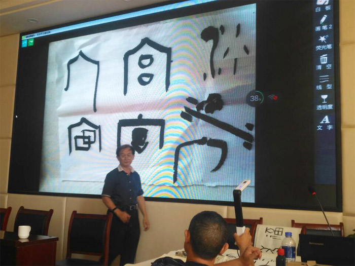 随后中国书协副主席包俊宜先生讲解了篆书学习的观念与体验,中国书法篆书史,并结合不同碑帖做了临帖和创作示范,针对国展要求对作业进行了精彩点评,并提出修改思路。
