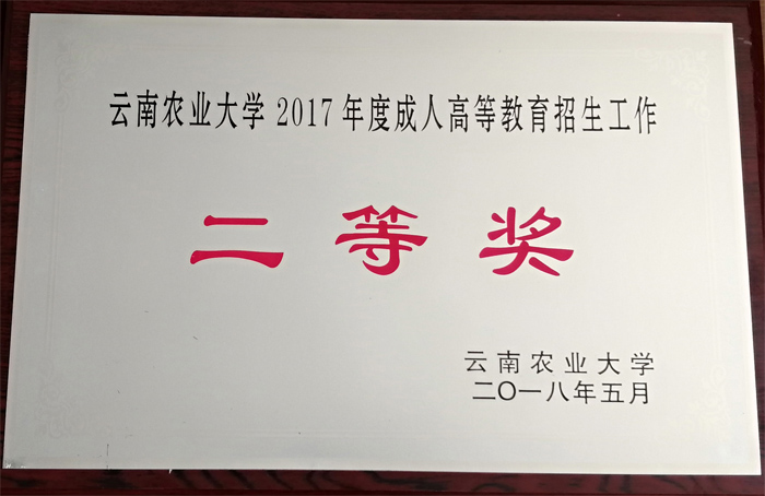 我校与云南农业大学联合办理成人高等教育函授专(本)科,工作成绩突显。近日,在云南农业大学成人教育2018年教学点工作会议上,学校成人高等教育工作中获“云南农业大学2017年度成人高等教育工作二等奖”和“云南农业大学2017年度成人高等教育招生工作二等奖”。(来源:成教科)
