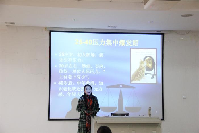 讲座内容丰富,生动活泼,董老师结合日常生活案例,主要从“压力来源、成因和征兆”、“性格与健康”、“管理压力的策略”等方面进行讲解。不仅从心理学理论上阐释了什么是压力、压力的成因、压力对身心健康的影响进行分析,还针对教师生活和工作压力做了现场调查并进行分类、测量和评估。