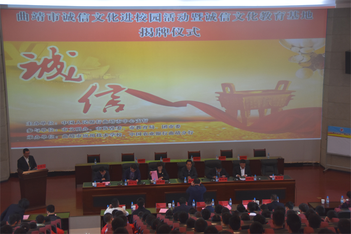 10月16日,由中国人民银行曲靖市中心支行、市文明办、市发改委、市教育局、团市委、曲靖应用技术学校、中国农业银行曲靖支行联合开展的诚信文化进校园活动曁“诚信文化教育基地”揭牌仪式在曲靖应用技术学校正式启动。
