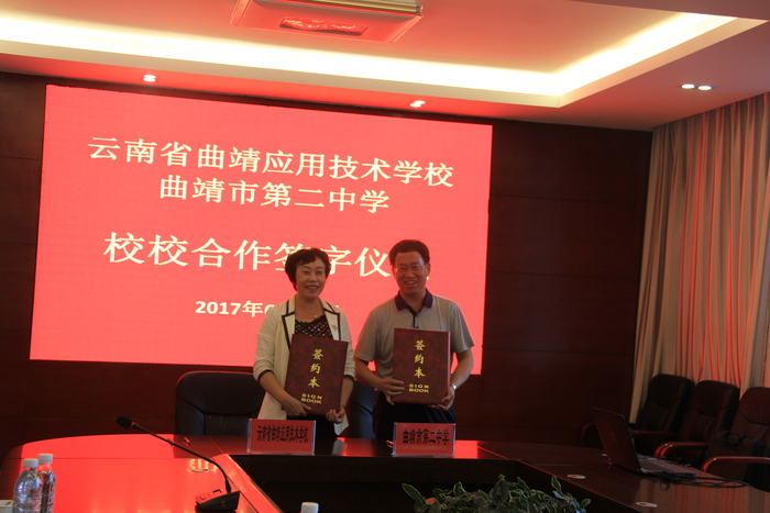 为打造普通高中与中等职业教育交流平台,实现普通高中与中等职业教育衔接,充分发挥双方资源优势,提升人才培养素质,6月15日下午,我校与曲靖市第二中学举行校校合作签字仪式,并在我校设立曲靖市第二中学技术体验教学实践基地。曲靖二中党委书记、校长李舜荣以及我校党委书记、校长吕庆芬,副校长郭海忠,副校长刘星、相关科室负责人参加了签字仪式。
