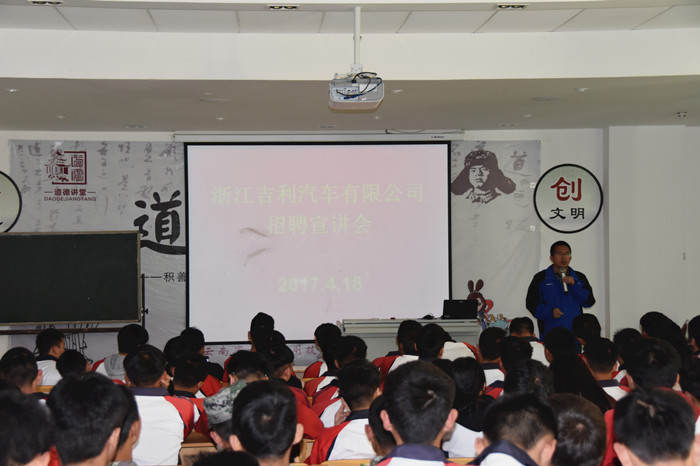 为了搭建良好的就业平台,更好地引导我校学生实习就业,4月18日,浙江吉利汽车有限公司到我校举行校园招聘宣讲会,学校组织120余名汽车维修与运用专业学生参加。
