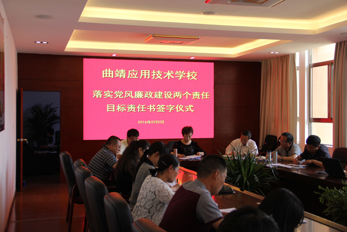 2016年5月5日下午,我校召开2016年党风廉政建设工作推进会,深入贯彻落实中央、省市委关于加强党风廉政工作的有关文件及会议精神,在与上级部门签订了领导班子目标责任书的基础上,进一步细化校内党风廉政建设指标内容,逐级逐层签订目标责任书,形成责任全覆盖。