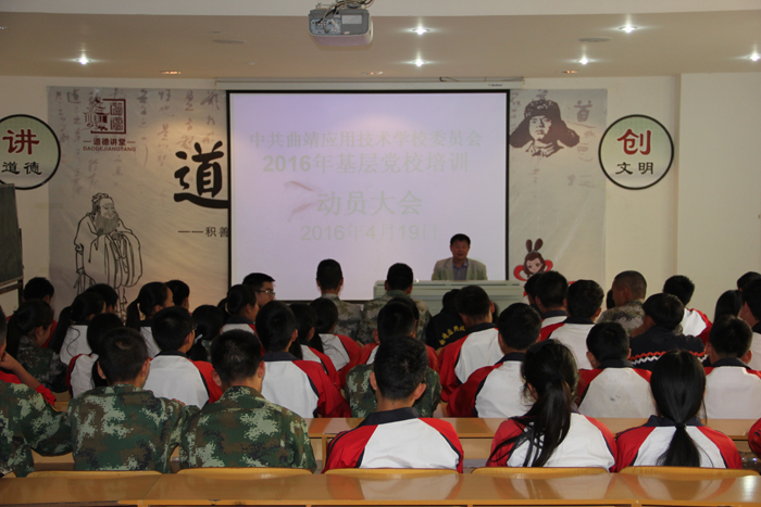 中共曲靖应用技术学校委员会2016年基层党校培训动员大会于4月19日在学校A栋教学楼116 阶梯教室举行。学校基层党校校长、纪委书记周建平做了动员讲话,对参加培训的1名教师和近70名学生阐明了基层党校培训的意义和作用,提出了培训的期望和要求。此阶段培训,将由学校纪委书记和五位党委委员为培训学员进行六个专题的培训,时间将持续到四月底。