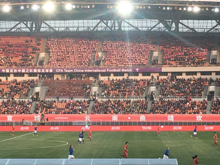12月6日下午四点,中国足协中国之队国际足球赛中国女足与意大利女足在曲靖市文体公园主体育场展开精彩对决。我校组织1200名师生观看了比赛,同学们秩序井然,情绪高涨,呐喊助威声响彻全场,为这场精彩比赛增添了不少的活力。在全体球迷的加油声里,中国女足不负众望,最后以2:0的比分战胜意大利女足。
