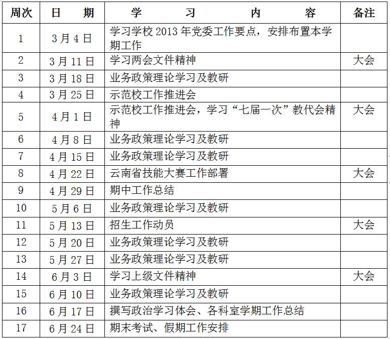 备注: 1、除大会学习外,其余均由各学习小组组长或科室负责人组织学习讨论;