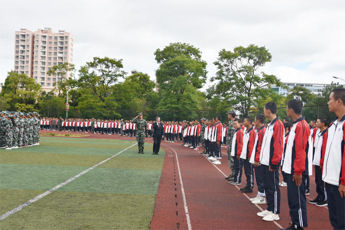 8月28日上午,学校2019年秋季学期新生军训会操表演在运动场隆重举行。学校中层及以上管理人员、校企合作负责人、各班级班主任及全校3300余名新生参加此次大会。大会由学校党委委员、副校长刘德华同志主持。