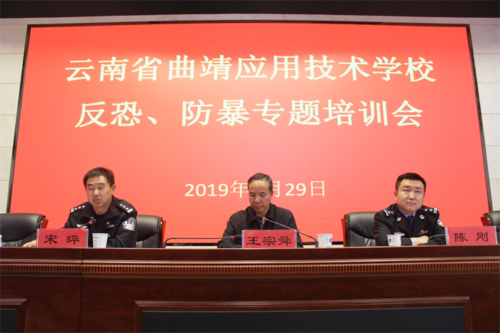 为深入贯彻落实曲靖市教育系统校园安全反恐怖工作约谈会议精神,进一步落实校园安全保卫各项工作措施,全力营造良好的教育教学秩序。9月29日下午,学校组织开展“反恐·防暴”专题培训会,学校中层及以上管理人员、校企合作负责人、安全专干、全体班主任、教官和曲靖天久保安服务有限公司等200余人参加此次培训。
