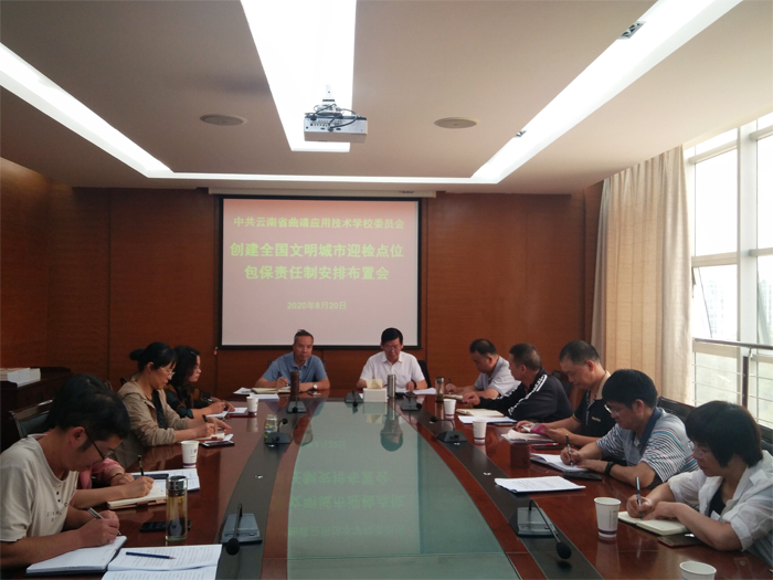 夏朝国同志传达了8月18日下午召开的《中央、省驻曲单位支持参与曲靖市决胜全国文明城市创建协调动员会》会议精神。夏书记从合力攻坚有差距、精准精细精致方面有差距、环境秩序有待提升、志愿者服务标准不高、窗口单位服务有差距五个方面,结合学校实际,介绍分析了当前全市创文工作以及学校创建工作存在的困难和问题,短板和弱项。会上,夏书记结合学校《2020年创建全国文明城市决战决胜迎检测评工作包保责任制实施方案》,对学校下一步创文工作分科室进行了包保责任安排布置,他强调在创文迎检测评的关键时期,各部门要增强使命感、责任感、光荣感,落实落细落小,确保学校在测评中争高分,不丢分。
