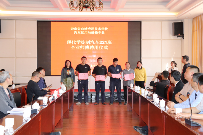 随后,各合作企业与学校签订了新一届现代学徒制班(汽车221班)的人才培养协议,学校为聘请的企业师傅颁发指导师傅聘书,通过传统的拜师仪式,明确学生与师傅的师徒关系,让学生懂得尊师重道,让师傅也明白肩上的荣誉与责任。同时,对汽车专业实训指导教师下企业锻炼作了安排,明确指导师傅与实训指导教师的师徒关系,会议还为指导我校实训指导教师的企业师傅颁发了结对聘书,希望以此来激励企业师傅为我校汽车专业师资的实践技能提升贡献更多力量。