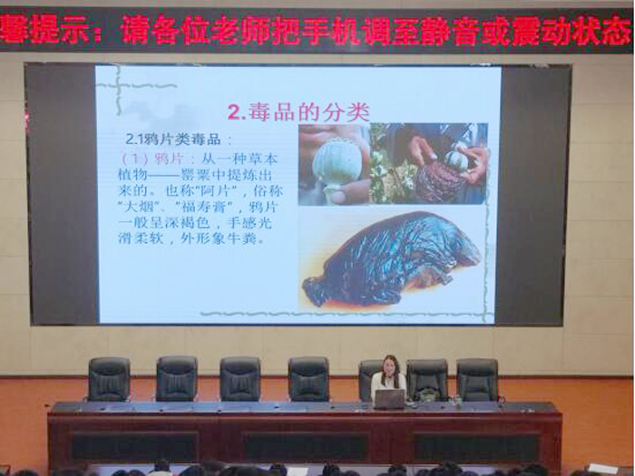 讲座上,高翠梅老师以详实的数据、图片和大量实例,生动、详细地为同学们讲解了毒品种类、形态、以及危害后果,教育学生在生活中要提高自我防范意识,拒绝和远离毒品,提高自我保护能力。