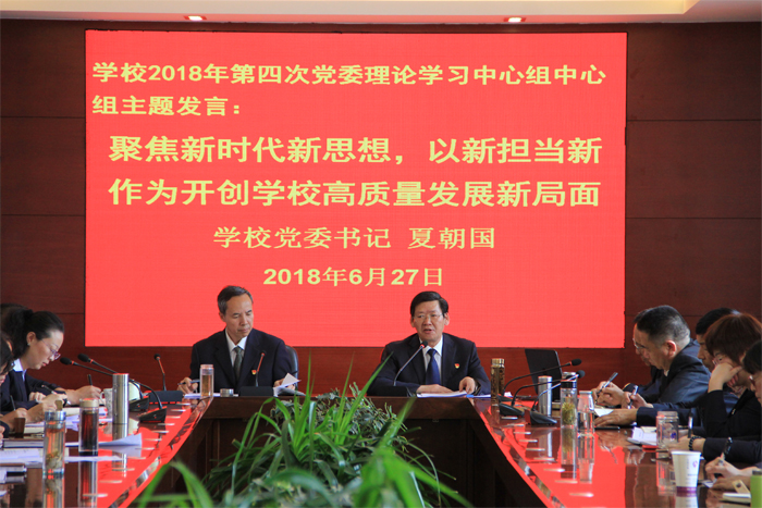 6月27日下午,学校在综合楼二楼中会议室召开2018年第四次党委理论学习中心组(扩大)会议,重点围绕《关于进一步激励广大干部新时代新担当新作为的意见》进行集中学习。学校党委班子成员参加会议,中层及以上管理人员列席会议,党委书记夏朝国同志主持会议并作中心发言。